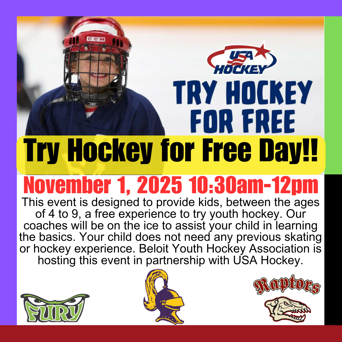 The Beloit Youth Hockey Association is just one of thousands of youth hockey associations across the country that team up with USA Hockey to provide days where your child can try hockey for free.